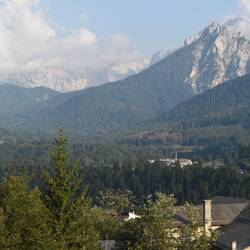 Good breakfast before heading out into the forest above the towns. Though signs warning of brown bears none to be seen. Switch from forest paths to road to bike path. Day clears nicely. Pass overMeer informatie