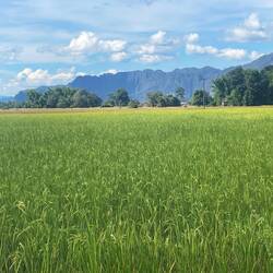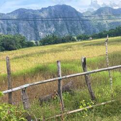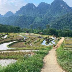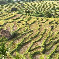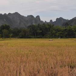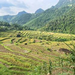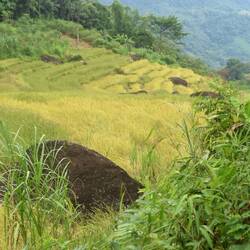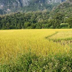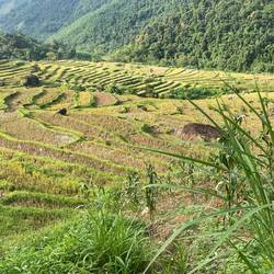 After a nice breakfast, organized ourselves for a hike. First stop - Bat Cave. From there descend into the river valley. Walk along a lovely river and amongst the rice fields. As its harvest time,Leer más