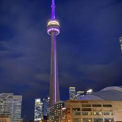 Wir geniessen den Sunset vom Tower aus, fahren mit dem Lift wieder runter und laufen dann weiter zum beleuchteten Toronto Sign. Dieses erstrahlt in den ukrainischen Farben. 🇺🇦