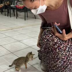 Nach dem wir das erledigt haben, geht es weiter zur Scooter-Vermietung. Dort mieten wir einen Scoopy für einen Tag. 🛵 Plötzlich entdecken wir ein zuckersüsses zweimonate altes Tigerli. 🐾 Es spielt mit Martinas Rock und dem Schuhbändel - allerliebst. 🥰