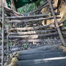 „Wasserrutsche“ (Wasserfall) existiert vor allem in der Regenzeit. Schade, hätte Martina ihren Müggi doch gerne den Wasserfall hinabrutschen sehen. 😅🤪 Dennoch haben wir Action. Müggi läuft über eine „modernde“ Holzbrücke. Beim Darüberlaufen bricht ein Teil ein. Müggi ist glücklicherweise schnell genug auf dem nächsten Abschnitt. 👏🙃