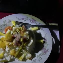 Als wir wieder zurück in der Unterkunft sind, wird uns das Zmorga serviert (Omeletten, Toast und frische Früchte). Danach zwei typische Süssigkeiten von hier. 🍳🍞🍍🍌