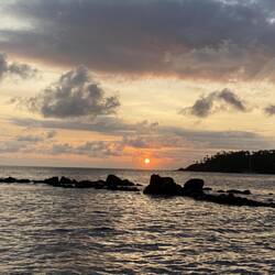 Nach dem Restibesuch besorgen wir einen Wasservorrat und gehen zum Zimmer zurück. Dort laden wir alles ab und spazieren gemütlich zum Meer, um den Sunset 🌅 anzuschauen.
