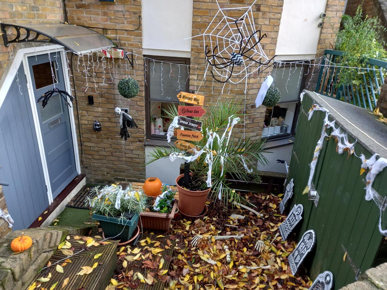 Da das Wetter nach dem Mittag besser wird (am Morgen regnet es stark), gehen wir auf einen längeren Spaziergang. Christine zeigt uns eine wunderschöne Gegend mit schönen Häuser und wunderbaren Halloween-Dekorationen.