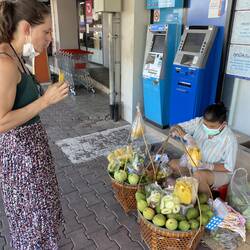 Dort angekommen, durchlaufen wir den Park, in der Hoffnung, eine Trinkkokosnuss und Früchte kaufen zu können. Wir finden leider nichts, deshalb verlassen wir den Park wieder und machen uns ausserhalb auf die Suche danach. Wir werden nach etwa 15 Minuten fündig.