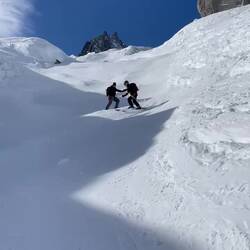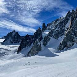 Na samą Mt Blanc nie docieramy, choć widać ją na wyciągnięcie ręki (albo 7h wspinaczki). Do Valee Blanche wchodzi się przez Aiguille du Midi, gdzie wwożą nas ekspresowo gondolki dwie. I dopiero tam zaczyna się prawdziwa przygoda. Przez system system tuneli pod Aiguille du Midi wychodzimy na zapowiedzianą grań, prawdziwie stromą i pokrytą zamarzniętym śniegiem. I tu szybki kurs poruszania się w rakach, kto nie załapie, ten niestety ląduje w śniegu. Zejście po grani rozgrzewa nas skutecznie, a że zgodnie z zapowiedzią Philippe, dolina jest osłonięta od wiatru, cześć naszych polarów i bluz ląduje w plecakach :-).