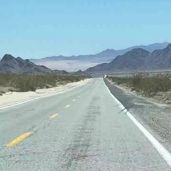 Zza zakrętu wyłania się punkt widokowy, i roztacza obraz pustyni, przez który najpierw szosa się wije, a następnie przechodzi w płaską, szarą i prostą jak strzelił autostradę.