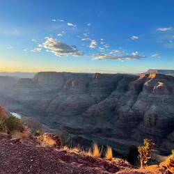 Widok, który każdy zna z książek, filmów i zdjęć. A jednak, w naturze, imponujący i przejmująco piękny. Żadne zdjęcie ani nawet film, nie odda skali i potęgi tak wyraźnie (chyba że Sir David’s Attenborough, ale na to jeszcze musimy popracować). Tym niemniej, oczywiście próbujemy, uchwycić rzeźbę skalną nakładających się na siebie ścian odnóg, barwę pasm, i światłocienie w zachodzącym słońcu. I oczywiście rzeki Kolorado, która uparcie kryje się w załomach i w głębinach wąwozu.