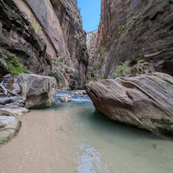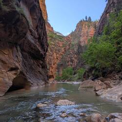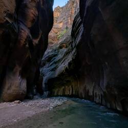 Tak czy inaczej, zrywamy się przed świtem, żeby po pierwsze znaleźć miejsce na parkingu (tryb prywatny niestety to już przeszłość), a po drugie, i co najmniej równie ważne, wyruszyć na szlak jako jedni z pierwszych i jeszcze o świcie nielicznych. Od początku widać, że nie będzie to łatwe, do Zion jedziemy w sznurze aut, na parkingu o 6:45, 15 min przed otwarciem parku, 70% miejsc jest zajętych, a do parkowego autobusu kolejka jak na Machu Picchu. Na szczęście autobusy jadą jeden za drugim, i zabiera nas już trzeci (tacy byliśmy dzielni!). I na szczęście tylko co czwarty pasażer jest w akwacie, więc może na rzece nie będzie strasznego tłoku.