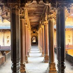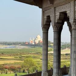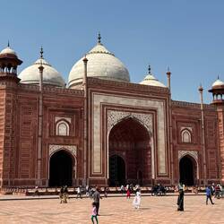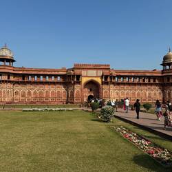 Nach dem Besuch des Taj Mahal machte ich mich weiter zum Agra Fort. Es war ein beeindruckender Kontrast, denn hier empfingen mich massive rötlich braune Sandsteinmauern, die sich deutlich von demLue lisää