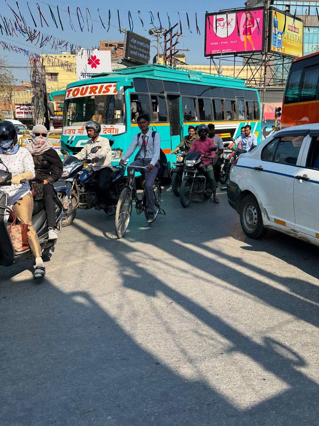 Mitten im chaotischen Straßenverkehr, begleitet von unzähligen Hupen und einem wahrenLue lisää