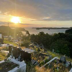 Weiter geht es Richtung Norden an grünen Almwiesen und der zerklüfteten Küste mit türkisfarbenen Buchten entlang. Unser Ziel: die Oke Bay Lodge, eine restaurierte, 140 Jahre alte Villa an einer Küste, die das National Geographic Travel Magazin angeblich als die zweitschönste der Welt bezeichnete. Eine sehr steile Auffahrt führt an der Lodge vorbei zu einem grasbewachsenem Plateau, welches Teil des Grundstücks ist, wo wir -oben angekommen - einen unglaublichen Ausblick auf das Meer und einsame Buchten haben und sowohl Sonnenauf- und Untergang sehen können. Hier wollen wir die Nacht verbringen. Ob die Zimmer der Lodge frei sind bringen wir gar nicht in Erfahrung. Als ich einem kleinen Pfad, der zur linken unseres Platzes beginnt, in der Abenddämmerung folge, stehe ich plötzlich vor Grabsteinen. Direkt vor mir, am Hang gen Westen gelegen ist ein Friedhof, die Namen auf den Grabsteinen in der Abendsonne sind maorische, man hört nur das Rauschen des Windes, ein magischer Ort.
