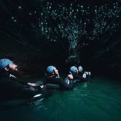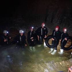 Und am nächsten Tag stehe ich mit einer Gruppe von insgesamt 7 Leuten (2 neuseeländische Studentinnen sind unsere Guides) vor dem Eingang der Höhle, vor Kälte bibbernd im dicken, aber vom Vortag noch nassen Neopren, mit Helm, Stirnlampe, Gummistiefeln und Gummireifen, die aussehen wie riesige Hämorrhoidenkissen.