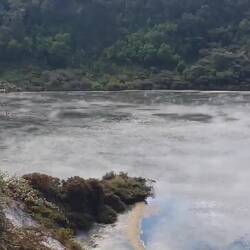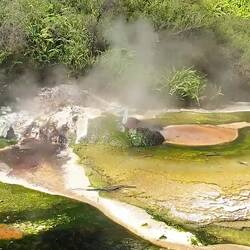 Wir lassen die Stadt hinter uns und fahren in das Waimangu Tal für eine Wanderung. Das Tal entstand 1886 durch einen Vulkanausbruch und ist immer noch aktives Vulkangebiet. Der etwa 4 Kilometer lange Weg führt uns vorbei am Frying Pan Lake, der die größte Thermalquelle der Welt ist mit einer Fläche von fast 4 Fussballfeldern.