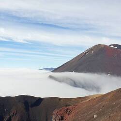 Nach einem erneuten kurzen Aufstieg durchbreche ich die Wolkendecke, die Sonne scheint, der Himmel ist blau und ich erreiche den Roten Krater, den mit knapp 1900 Metern höchsten Punkt der Wanderung. Und ich bin der einzige! Ich packe mein Käsebrot aus und schaue in den Abgrund des Roten Kraters und auf den Schicksalsberg zu meiner rechten, der wie ein grosser Trichter mit steilen, rötlichen Hängen aus den Wolken ragt.