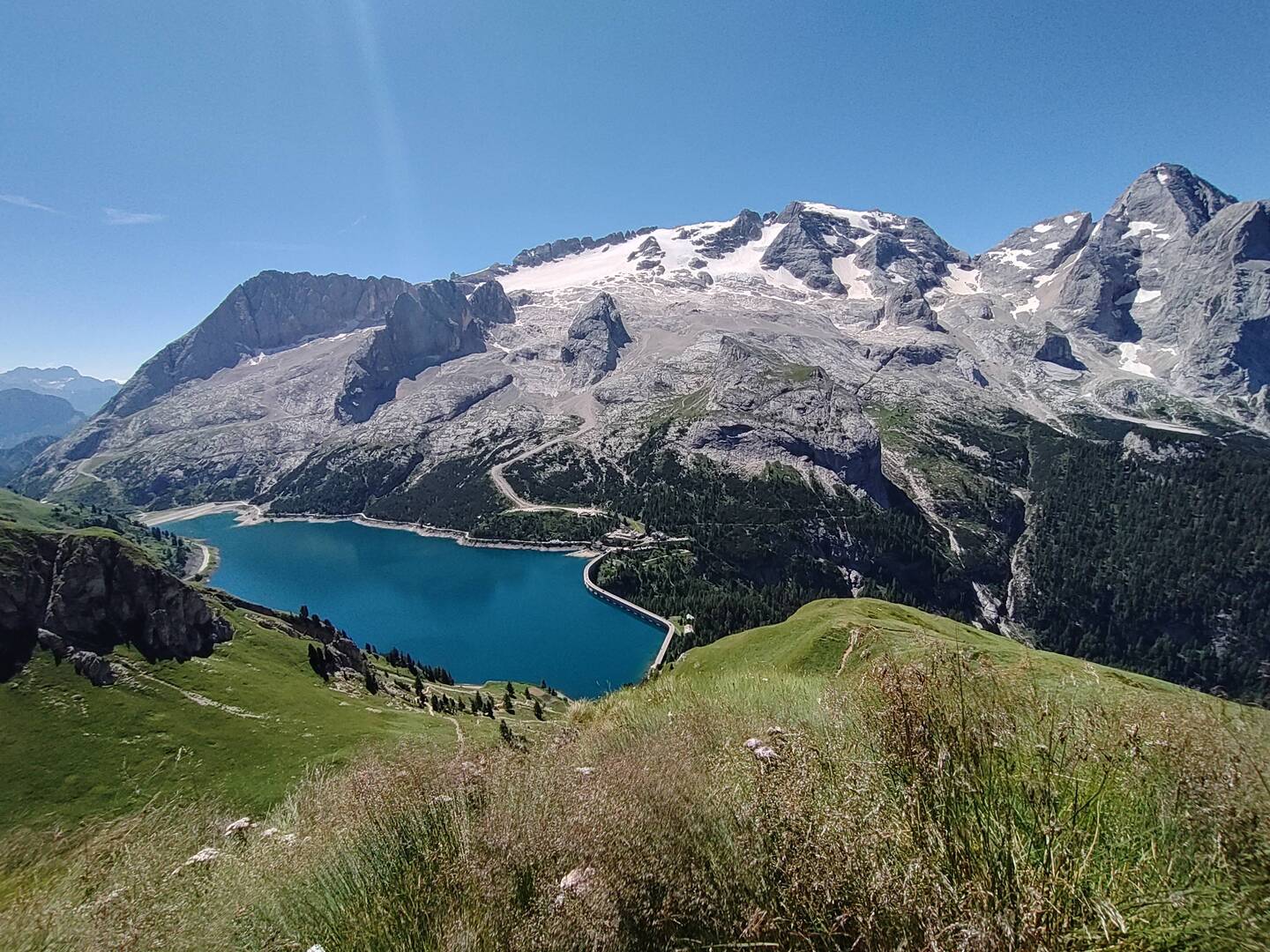 Emozionante finire la salita e trovarsi lago fedaia e Marmolada davanti in tutta la sua imponenza.