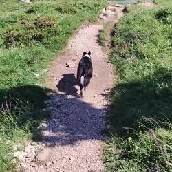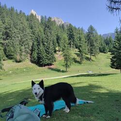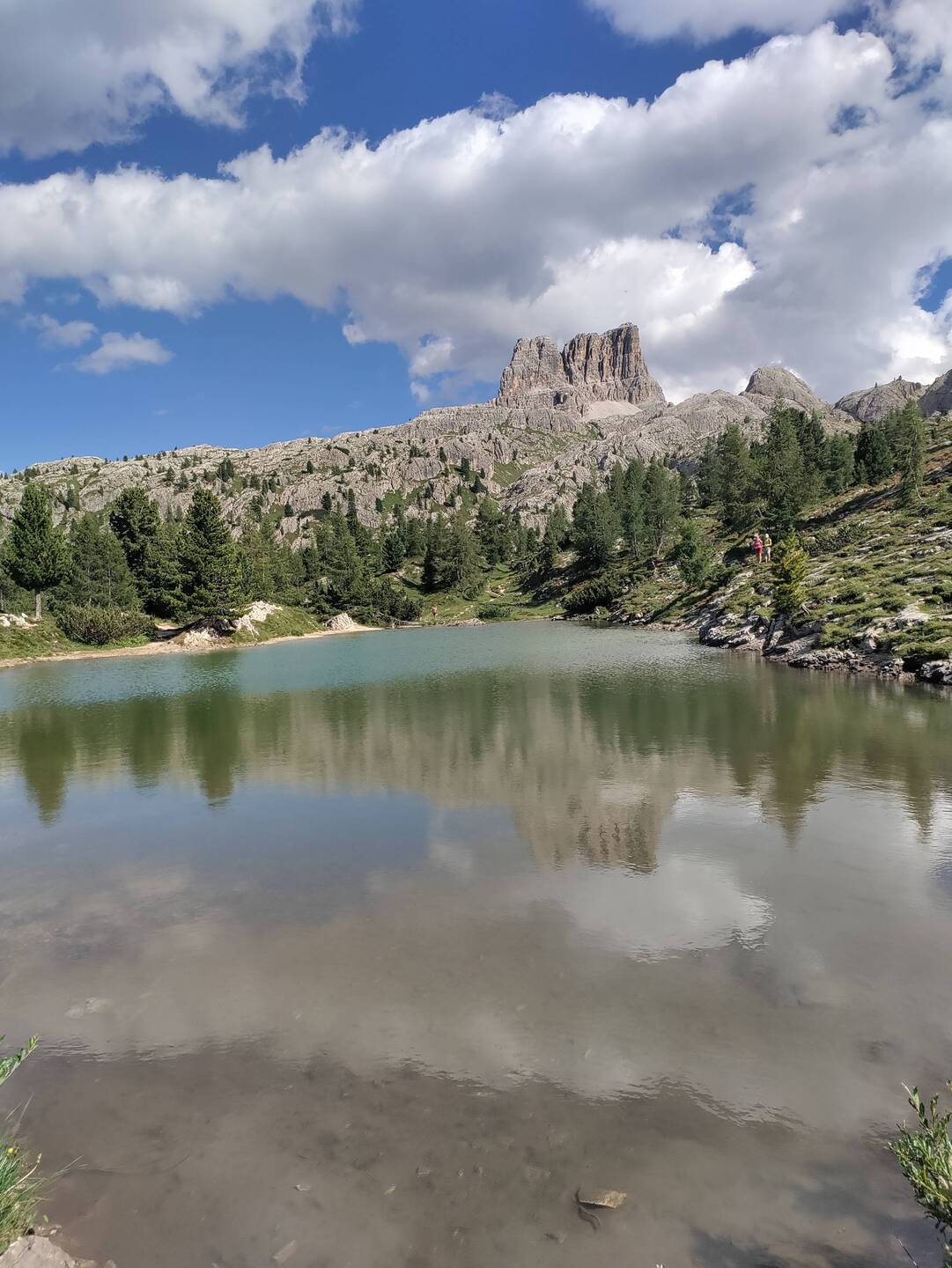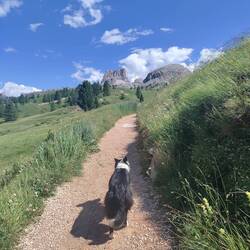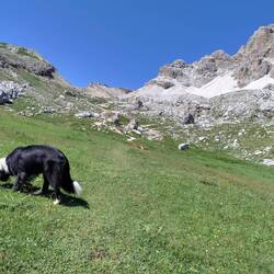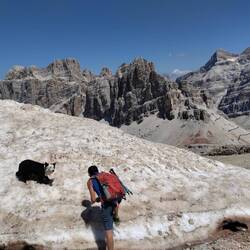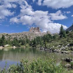Scesi dalla funivia facciamo una tappa rinfrescante al lago Limides. Direzione 5 torri dal passo falzarego. Bei panorami aperti. 4 km con 120d+e un bel bagnetto per Nala.
