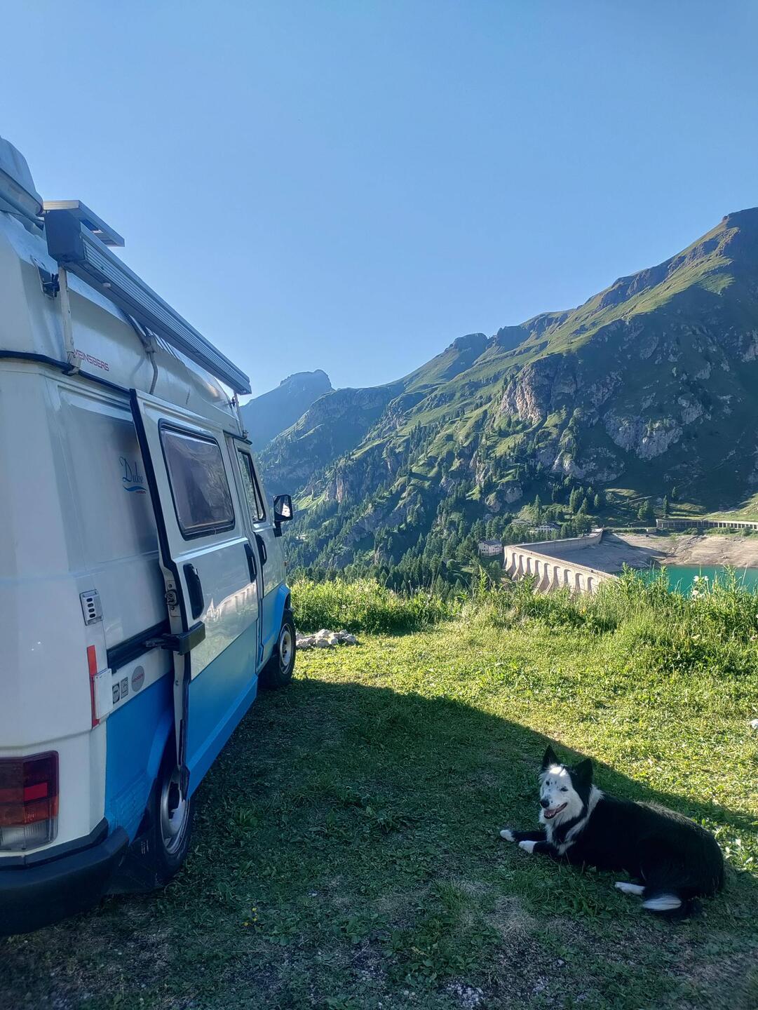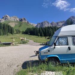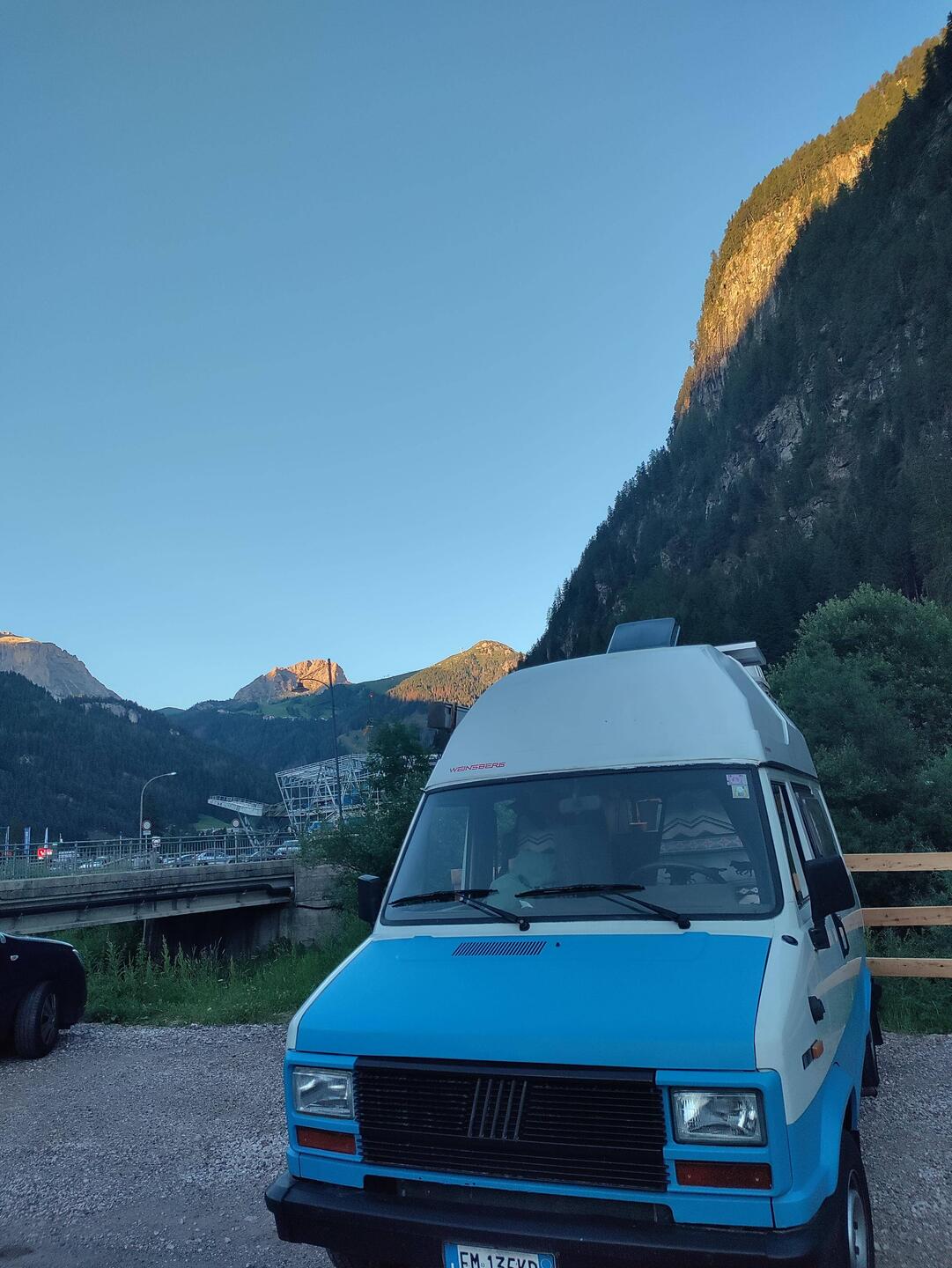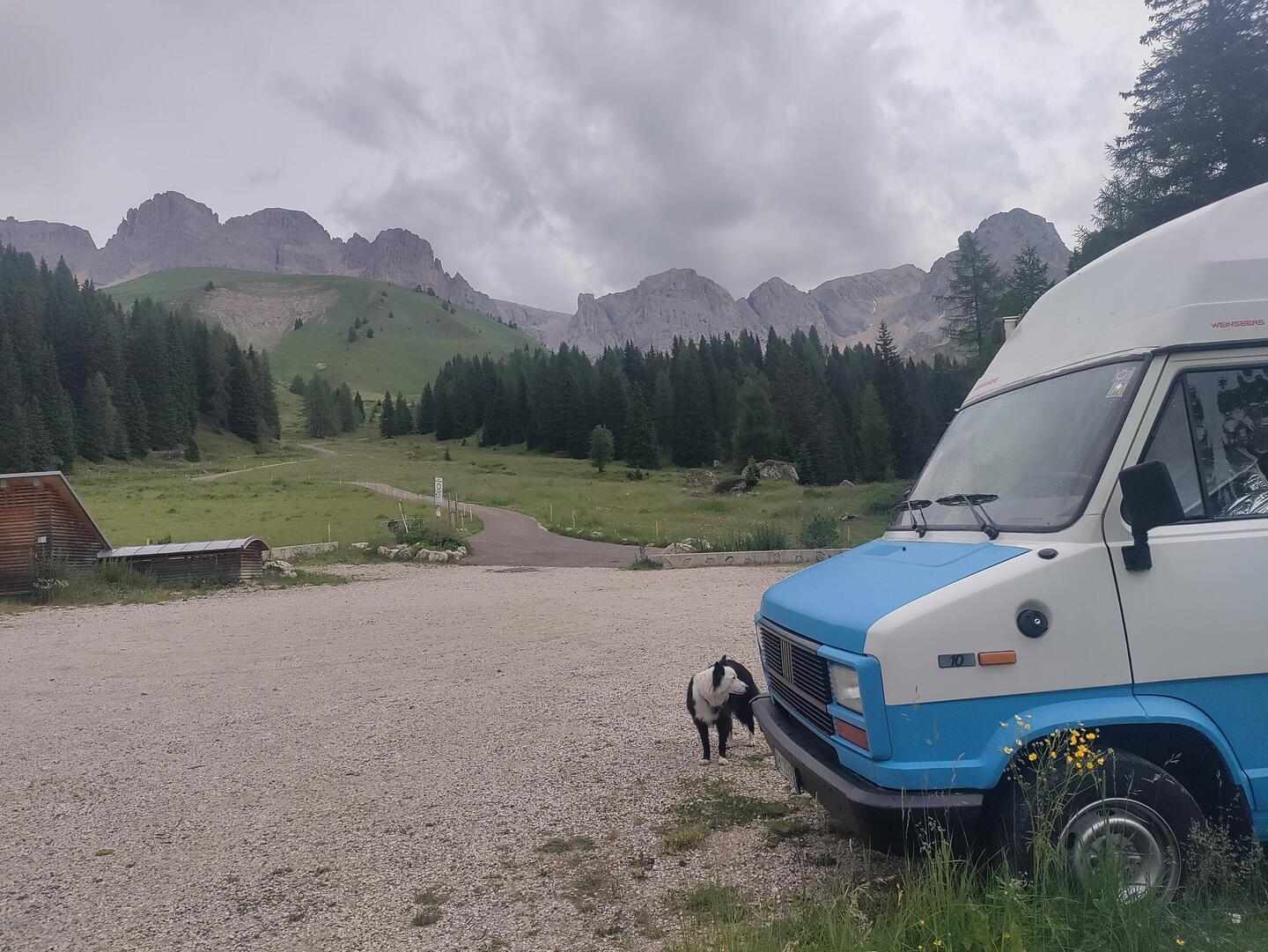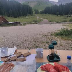 Saliamo al passo fedaia e ci sistemiamo nel nostro posticino preferito con prato e vista su Marmolada e montagna davanti