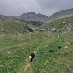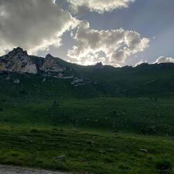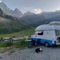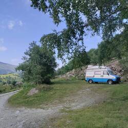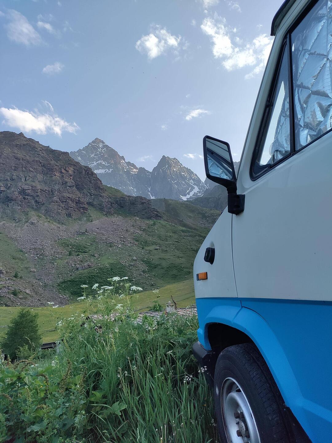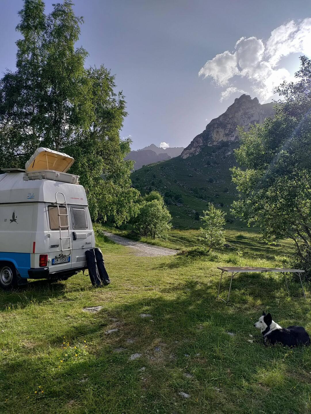 Dopo 8 interminabili km sperando di non incrociare nessuno raggiungiamo questo angolo sereno. Solo noi, le marmotte (che forse hanno sgranocchiato un po' di camper) e le mucche.