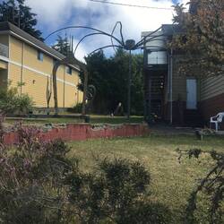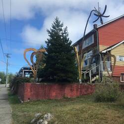 Impressionen aus dem Dörfchen am Pazifik, viele Blumenampel zieren die Häuser und Kunst aus Wurzeln