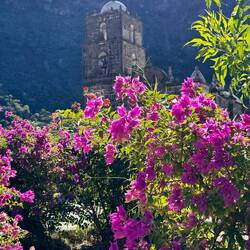 Dank der klimatischen Verhältnisse wachsen hier die Bougainville überall und in allen Farben.