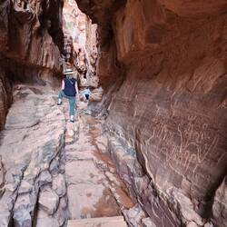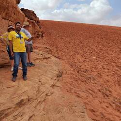 After a long drive south, we arrived in Wadi Rum, a Protected Area, a valley known for its rock formations, sand dunes, and natural arches. This area is also famous for its link to Lawrence of ArabiaLæs mere