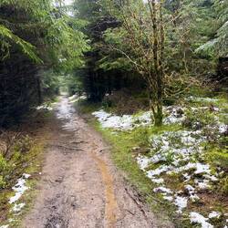 Je höher ich komme, desto kälter wird. Es liegen kleine und größere Schneeflecken auf den Gräsern. Es geht hoch auf den Langenberg (…m), den höchsten Berg NRWs. Am Richtplatz (800 m) mache ich auf einer schönen Bank in der Sonne Pause. Doch dann zieht es sich zu, es fängt wieder leicht an zu graupeln. Da hilft auch der Regenponcho gegen die Kälte der Graupel. Am nächsten Rastplatz auf dem Langenberg treffe ich zwei Holländer. Wir quatschen, Ich gehe weiter, es geht leicht bergab und nach 200 m sehe ich ein Schild, dass der Langenberg hinter mir liegt. Ich lache, da verpasse ich glatt den Moment auf dem höchsten Berg NRWs wahrzunehmen.