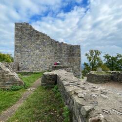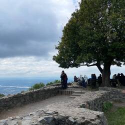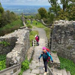 Dann weiter bis zur Gastwirtschaft Löwenburg. Dort versorgen wir uns mit Wasser und besuchen die Toilette. Platz wäre für uns nur draußen gewesen, da die große Gruppe erwartet wird. Aber wir wollen eh weiter zur Löwenburg-Ruine. Noch ein weiterer Anstieg und wir erreichen den höchsten Punkt des heutigen Tages mit 440 m auf der Löwenburg. Da ist einiges los, aber wir finden eine windgeschützte ruhige Ecke und kochen uns Kaffee. Und essen unsere Stullen. Und zum Kaffee teilen wir uns die Zimtschnecke vom Bäcker aus Königswinter.