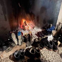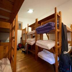 Endlich nach 7:19 Stunden komme ich in der Wanderhütte an. In meinem Rucksack ist unten am Boden eine Pfütze. Das hatte ich bisher noch nie. Meine Wanderstiefel stelle ich zu den anderen ans Feuer im Kamin. Es sind schon viele da. Aber erst jetzt um 16 Uhr ist Check-In und damit kann man auch erst jetzt warm duschen. Nicht einmal heißes Wasser für Tee gab es. Eine Mitwanderin erzählt, dass die Helferin des Hüttenwirtes einen Wäschestände in die Hüttenstube rausgestellt hat. Das wollte der Hüttenwirt zuerst auch nicht. In zwei Nächten zuvor hat er einen Amerikaner draußen vor dem Eingang schlafen lassen. In der Nacht fing es ebenfalls an zu regnen. Wer nicht reserviert hat, kommt nicht rein. Da sind die Hütten des DRV doch anders und besser aufgestellt.