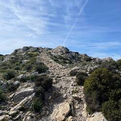 Eine halbe Stunde später laufen wir dann los. Vorbei an den mittelgroßen, größeren, sehr viel größeren und den Mega-Yachten im Hafen von Port Andratx. Es geht jetzt erstmal nur bergauf. Uns wird warm. Wir sehen noch einen kleinen Regenbogen und dann ist es auch vorbei mit dem Regen. Ausgeschildert ist der GR221 hier nicht. Ab und an sieht man kleine Steinhaufen zur Orientierung. Aber die Wander-App Komoot hilft bei der Wegbestimmung. Unser Ziel ist „es Tres Pigons“ , ein Bergkamm 308 m), von dem man einen tollen Blick auf die Isla oder „sa Dragonera“ hat. Mallorquinisch ist übrigens etwas anders als das „Castellano-Spanisch“. Zwei Männer kommen uns kurz vor dem Bergkamm entgegen. So sind wir dort oben allein.