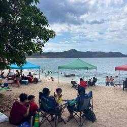 Als ich heute gegen 7.30 Uhr an den Strand kam, war schon alles voll, voll mit Einheimischenfamilien, die scheinbar nach der Fiesta, die bis morgens ging, gleich an den Strand sind und sich heute den Strand komplett zurück erobert haben.Leia mais