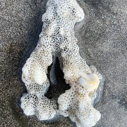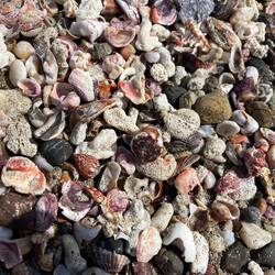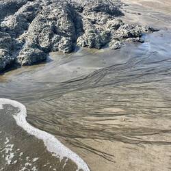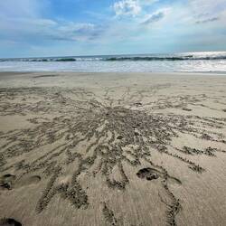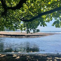 Ein völlig naturbelassener, brauner Strand mit Treibholz, eingefasst von üppiger Vegetation, kilometerweit, unbebaut und absolut plastikfrei.