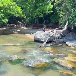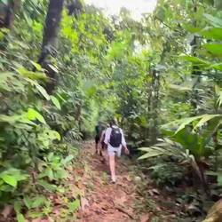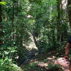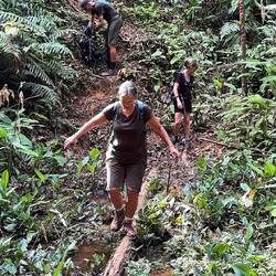 Das Tempo war sehr zügig und die Steigungen erheblich, es ging beständig sehr steil über rutschigen Lehmboden nach unten, wo meist ein Fluss zu überqueren war und dann wieder sehr steil nach oben mit riesigem Schrittmaß. Über die Bäche sprangen wir oder balancierten auf Baumstämmen. Die Allgegenwart von Puma, Jaguar, giftigen Schlangen und aggressiven wilden Riesenschweinen war spürbar und für jeden Schritt war absolute Konzentration nötig. Es war sehr feucht und heiß und wir hatten nur begrenzt Trinkwasser dabei, außerdem hatte ich bestimmt noch 7 kg Gepäck dabei. Heftig!