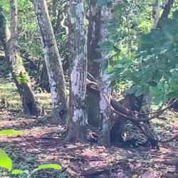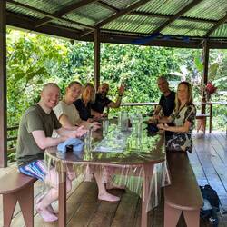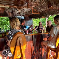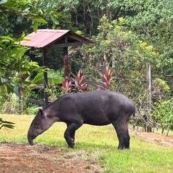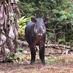 Am späten Nachmittag, nach vier Stunden intensiven Wanderns, tauchte fast aus dem Nichts unsere Herberge auf, wo wir von Fitzcarraldo und seinem Koch empfangen wurden. Wir waren beeindruckt von einer komplett aus Holz gebauten Ranch mit Bar, wo uns sofort Frei-Whisky und Bier gereicht wurde. Wir hatten einen witzigen Abend, waren aber komplett so erledigt, sodass wir alle bereits um 19.30 Uhr schlafen gingen. Am nächsten Morgen bekamen wir Besuch von einem Tapir, auf dem ein weißbrauner Falke saß, der dem Tapir die Zecken entfernte. Was für ein Glück- es gibt in Zentralamerika nur noch etwa 5000 Individuen.