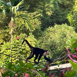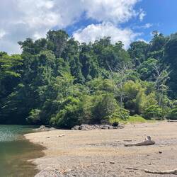 Wir verbrachten den Vormittag rund um die Rangerstation in La Sirena, sahen alle vier in Costa Rica lebenden Affenarten (Kapuziner-, Klammer-, Totenkopfäffchen und Brüllaffen), die Fer-de-Lance-Schlange, die giftigste Schlange des Landes, die wohl größere Beute gemacht hatte und anscheinend schon seit Tagen aufgerollt zwischen den Wurzeln eines Baumes verdaute, zwei schlafende Faultiere, Vögel und Fledermäuse.