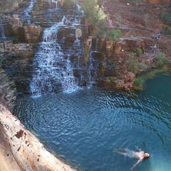 The walk down into Dales Gorge provided 2 idillic swimming spots. First was Fortescue Falls, which is the only spring-fed waterfall in Karijini. Second was Fern Pool, a picturesque waterhole andLæs mere
