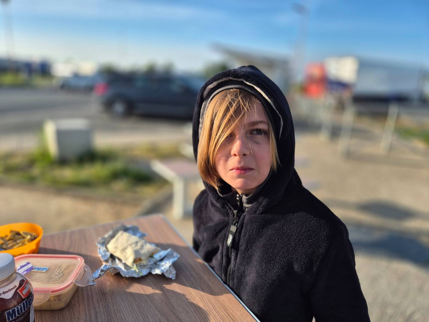 Kurz hinter Amiens ist Frühstückszeit. Apropos, kurze Arme sind am Gare de péage unpraktisch.