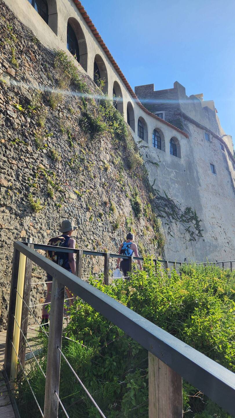 We took our starting group photo after our hearty breakfast and headed out. We got right back onto the bike path by our hotel then followed the trail through some of the village and kept either on the bike path or little detours here and there past horses and houses but staying along the coast. We came across one of the largest stone piles from various locals and pilgrims and had fun looking at the painted rocks. In one part of the mountain we saw the old cannons fortifications built into the rock. It was a really rocky shoreline until we got to Baiona which had beautiful sand beaches. Coming into Baiona, we had a nice descent into the town. There was a large statue overlooking the town and the Monterreal fortress. This is definitely a fishing and tourist town based on the seafarer statues and symbols and the beautiful beaches. We stopped for a coffee and pharmacy break, then got going out of town. We came across a really nice red and white tiled area, waved to a school group on a field trip and made our way to a beach to eat our lunch. We stopped at Praia (beach) America. A lovely man stopped and asked if he could take a photo for us. After, Joanne discovered he took a selfie photo of himself as well🤣🤣We had a very friendly dog stop and hang about because he could smell our food. His owner came over and we tried a bit of a conversation then eventually he got his dog to go!! We enjoyed the beautiful scenery while eating. We had a couple of steep hills and meandered until we got to a nice gravel path along a little river. With 7km to go we had an older man who heard our bike bell but panicked and didn't know which way to go to get out of our path. I braked and the gravel grabbed my tire and down I went. My knee and hands took the brunt. I had to sit for a moment and get cleaned up with bandaids on my one hand but just left my knee until I could clean it up at the hotel. Just another part of the adventure😬🤭