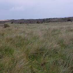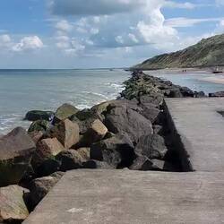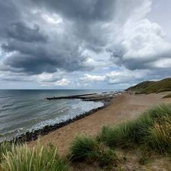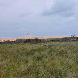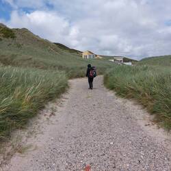 Wir warteten darauf, dass der Regen nachließ und starteten gegen Mittag zu Råbjerg Mile. Das lag nicht unweit von uns und so sind wir direkt dort hin gelaufen. Es liegt direkt an der Straße, an der auch unser Camp zu finden ist.