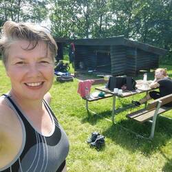 Wir wollten noch etwas länger pausieren und suchten uns dafür einen anderen Platz. Wir liefen noch ein paar hundert Meter - KNACKTEN DABEI DIE 200 KM MARKE - und fanden einen kleinen Strandabschnitt am gleichen See. Das war ein schöner Platz. Es gab eine Bank mit Tisch, worauf bereits zwei Damen saßen. Wir fragten, ob wir uns dazu setzen können. Sie bejahten und fingen auch gleich einen Schnack an. Wir erzählten von unserem Abenteuer und die beiden - übrigens Zwillinge - von ihren. Petra ist in der Orga ihres Busunternehmens tätig und Anja als Sachbearbeiterin beim Kreis. Beides auch abenteuerlich.