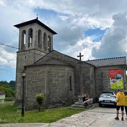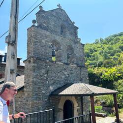 Today’s walk was essentially an 8 km steep climb with three small villages along the way. We stopped at was once a monastery at La Faba, at Iglesia San Andre where monks, even now, on occasion, wash people’s feet at certain times of the year. At the cafe there, we were greeted with whistling sounds in the back room, reminding me of Denis Alain, when, all of a sudden out pops the waiter, the spitting image of Shea, Denis’s son. Another Canadian couple , Val and Jamie, from Collingwood, Ontario shared an experience they had yesterday off the beaten track, when an elderly, Spanish couple invited them into their humble home for a piece of chestnut cake. There is a striking contrast here between the simplicity, poverty even, of the people’s existence and the richness of their lives. It seems like they would give their last bit of food just to make others happy. Val and Jamie had a bit of an encounter with wild boars, a sow and her piglets, on the way back to the trail but nothing of any consequence. As Jamie was telling me the story of the sow, he noticed my Blue Jay reminding him of a statement from a guy last week who said, “Have you seen the Canadian guy wearing the Blue Jays hat?”