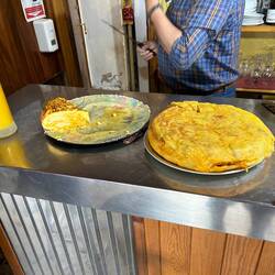We spent much of the afternoon at a cafe people watching, nothing the many pilgrims who set off today. Last night, we ate some traditional Spanish food: tortilla espanola (onions, potatoes, egg cooked in olive oil), tapas, morcilla (blood sausage in spices), paella, and calamari. We ate too much last night, so we stuck to plainer rice and vegetables today; however, we did allow for an ice cream and pastry treat.