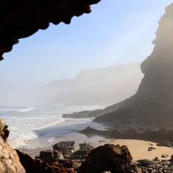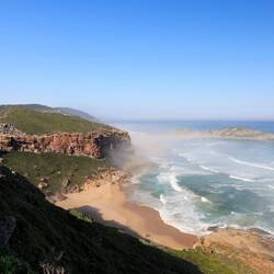 Die von Gischt vernebelte Südküste unterscheidet sich in der Vegetation von der gegenüberliegenden Küste, an welcher eine grosse Brutkolonie von Kapfellrobben lebt, die sich in den Wellen vergnügen oder sich an Land sonnen.