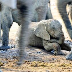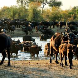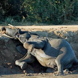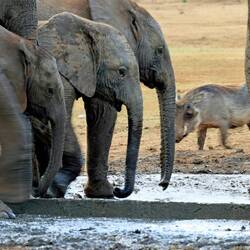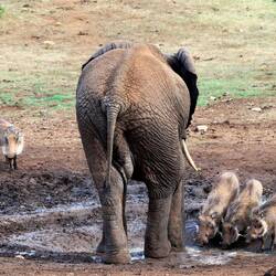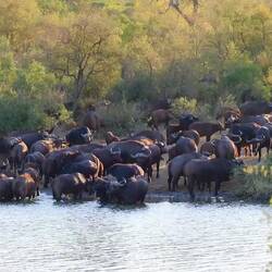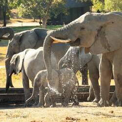 Kurz nach unserer Ankunft im "Shindzela Tented Camp" wurde das Mittagessen serviert. Gestärkt und mit Vorfreude starteten wir die im "Timbavati Wildreservat", von Sam geleitete, erste Pirschfahrt. Bereits nach wenigen hundert Metern bescherte uns eine am Wasserloch trinkende bzw. badende, grosse Elefantenherde ein vielfältiges Schauspiel.