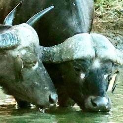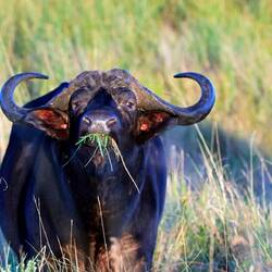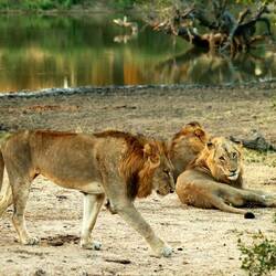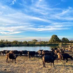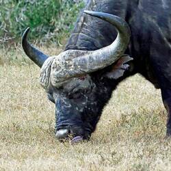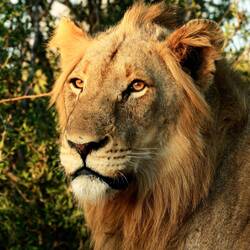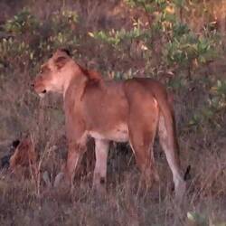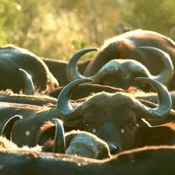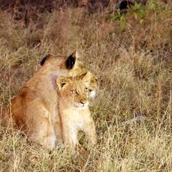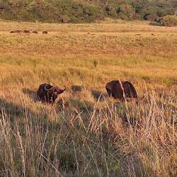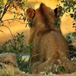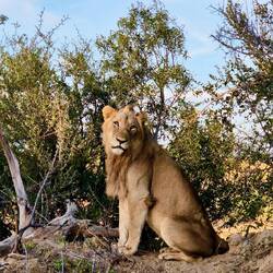 Auf dem Nachmittagsdrive begegneten wir mindestens hundert Büffeln. Kurz darauf erhielt unser Guide eine Überraschungsinfo. Wir machten kehrt zurück und es präsentierten sich uns drei männliche, junge Löwen am selben Ort, wo sich die Büffelherde befand. Der Anführer der Löwen setzte sich auf einen Hügel, um die Büffel von weiter oben zu beobachten.