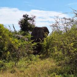 Wie gestern gab es auch heute im südlichen Nationalparkgebiet wenige Tiere zu beobachten. Doch bereits einige hundert Meter nach dem fiktiven Grenzübertritt in den Norden des Parks, waren die ersten Elefanten in der Busch- und Baumlandschaft auszumachen; zahlreiche weitere folgten.