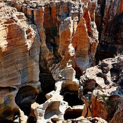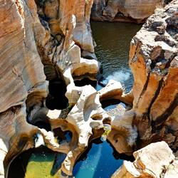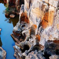 Die "Bourke’s Luck Potholes" sind eigenartig erodierte Felsen im Blyde Fluss. Die bizarren, zylinderförmigen Hohlräume im Felsen wurden über Jahrtausende von Sand und anderem Schutt im wirbelnden Wasser des schnell fliessenden Flusses geformt.