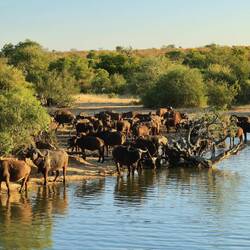 Wir durften Zebras, Giraffen und eine Büffelherde beobachten. Sehr beeindruckend war eine fünfzigköpfige Elefantenherde direkt vor der Lodge. Einige Kleintiere waren darunter und tranken ebenfalls aus dem künstlich angelegten Wasserloch.