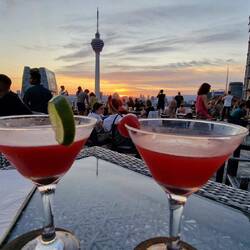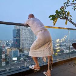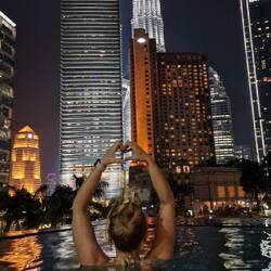 Heute Abend geht’s zu einer neuen Location: die 59. Etage im Banyan Tree Hotel, um den Sonnenuntergang und die beeindruckende Skyline zu bewundern. Die Bar heißt Vertigo – ein Name, der Programm ist! Schwindelig kann man in der Höhe werden... oder von den Cocktails. Anfangs hatten wir ein bisschen Schwierigkeiten mit dem Personal, aber mittlerweile sind wir die besten Kunden, die man sich wünschen kann – charmant, durstig und immer für einen Spaß zu haben! Nach gut 3 Stunden im Cocktailrausch geht's die 59 Etagen wieder runter.