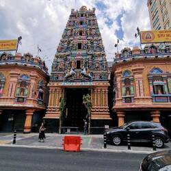 Am Hindu-Tempel Sri Maha Mariamman machen wir den nächsten Stopp – ein Ort voller Farben, Musik und Räucherstäbchen.